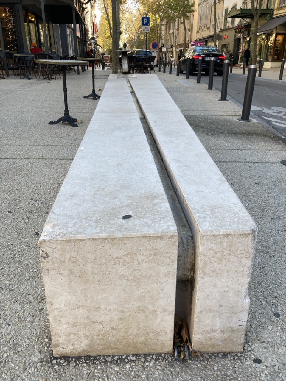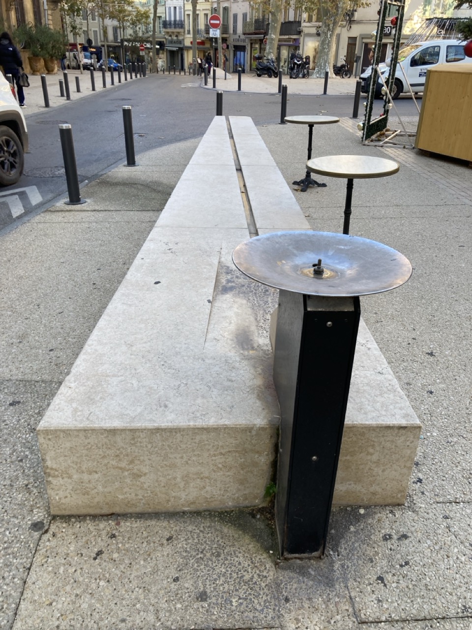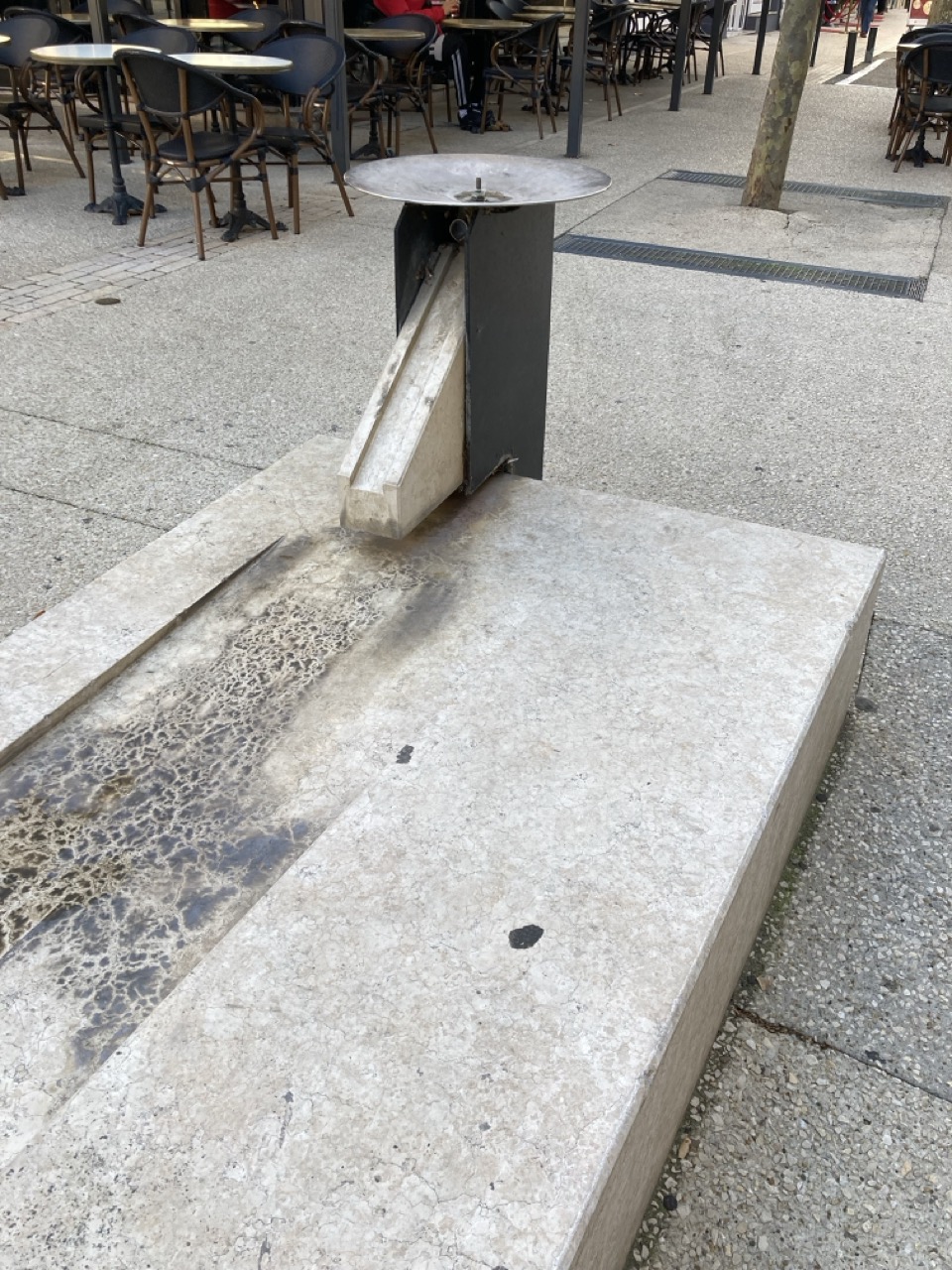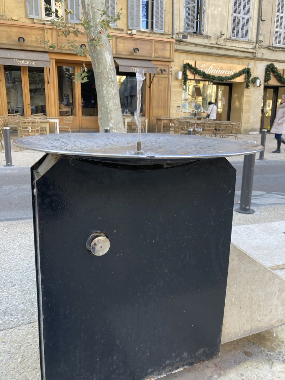 1) Cette fontaine fonctionne avec un bouton poussoir latéral qui n'est pas facilement visible et peu de passants savent que l'eau peut couler.