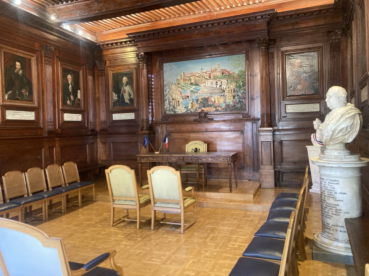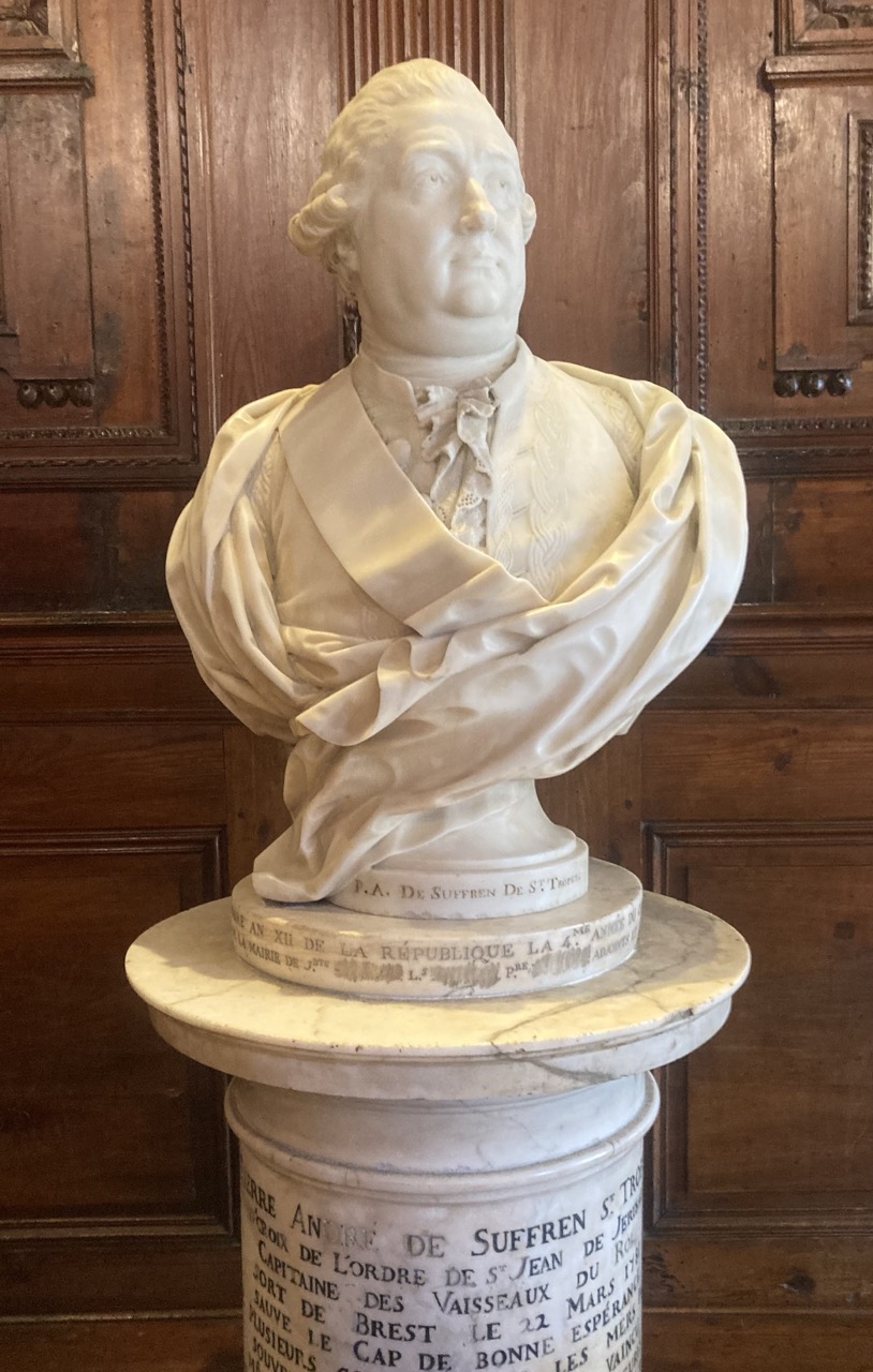 Le buste du Bailly DE SUFFREN a été sculpté la même année par Jean Joseph FOUCOU: les consuls voulant rendre hommage au célèbre marin et ses victoires sur la flotte anglaise aux Indes, ont fait réaliser la salle et la sculpture en même temps, la salle devant servir d'écrin pour le buste.